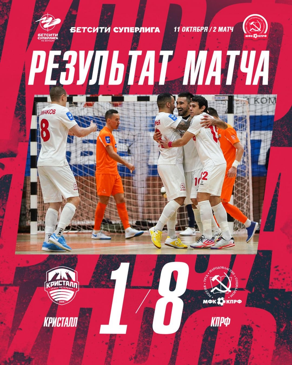 Во второй половине МФК КПРФ продолжил забивать. Шимбинья оформил хет-триак, Янар Асадов в свой день рождения набрал 1+2. Забили Ниязов, Ильин и Безруков. А итоговый результат – 8-1!