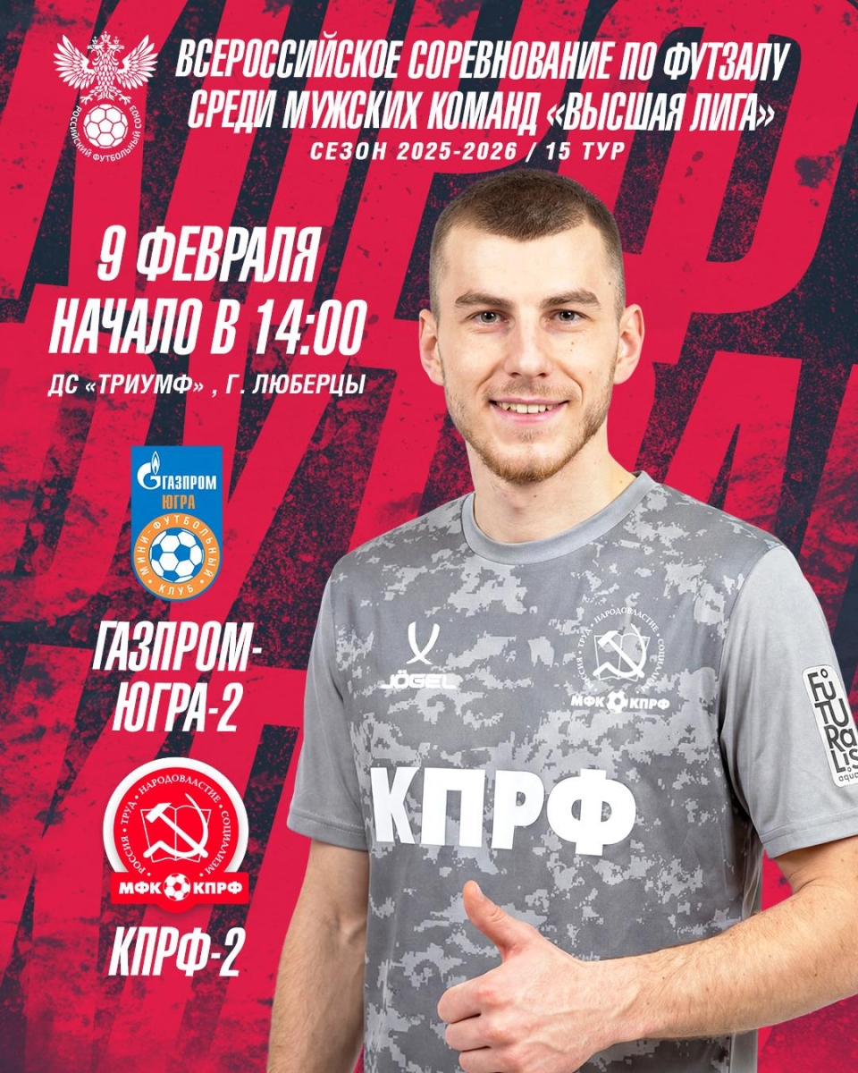 Матч «Газпром-Югра-2» - «КПРФ-2» пройдет в ДС «Триумф» (г.Люберцы) 9-го февраля, начало 14:00.