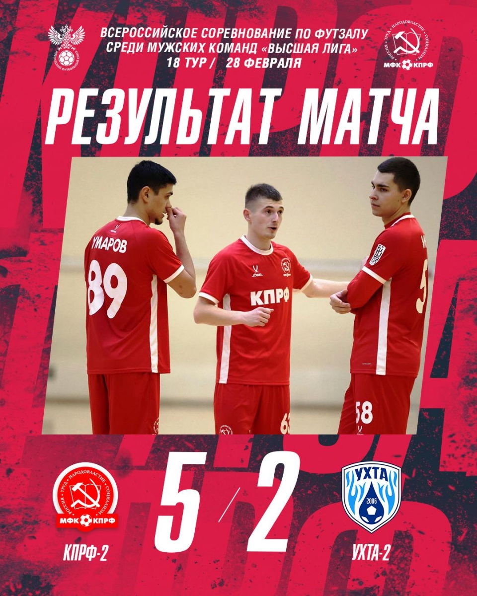 Вскоре ухтинцы остались в меньшинстве из-за удаления своего капитана Мусатова. «КПРФ-2» быстро реализовала лишнего и тут же забила еще два мяча.