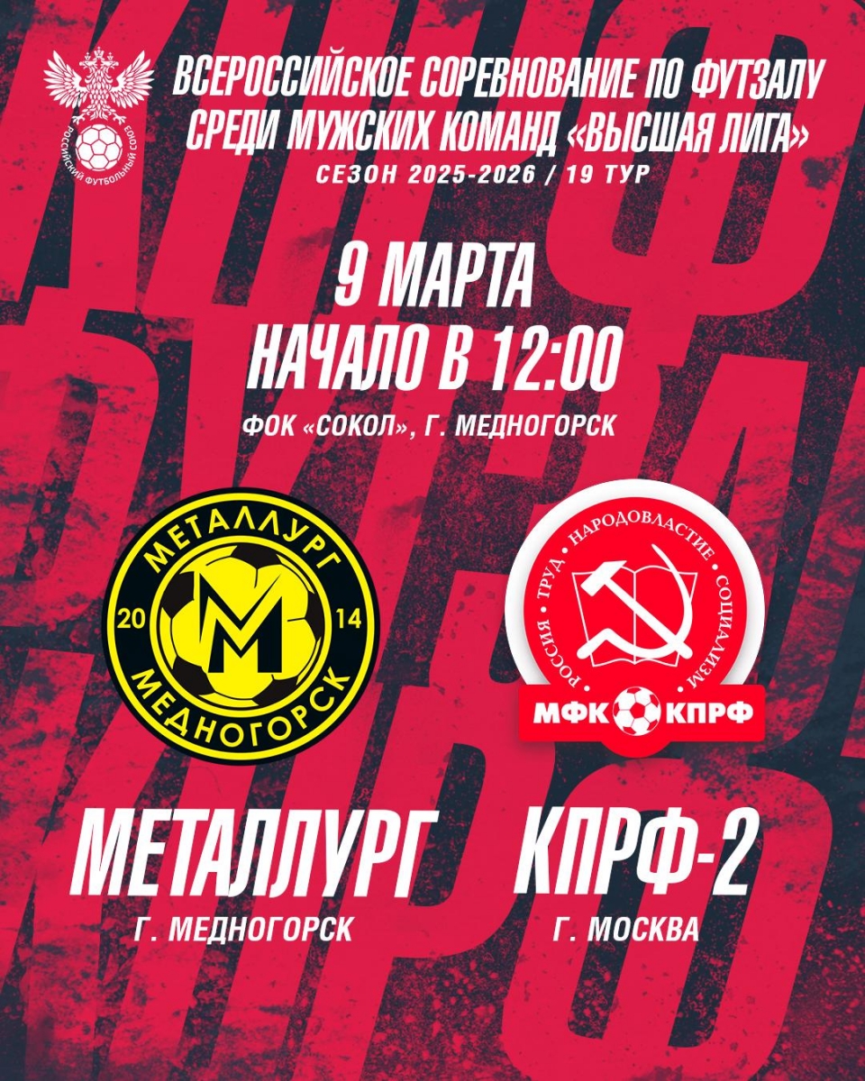 Матч "Металлург" - "КПРФ-2" состоится в понедельник, 9-го марта 08.03.2026, 18:14 Важная информация! Матч "Металлург" - "КПРФ-2" состоится в понедельник, 9-го марта. Начало 12:00 (мск).Болеем за "КПРФ-2"!