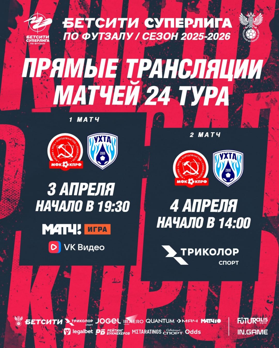 В пятницу и субботу мини-футбольный клуб КПРФ в центральных матчах 24-го тура чемпионата Бетсити Суперлиги будет в УСЦ "Юность" принимать "Ухту". Смотрите прямые трансляции!
